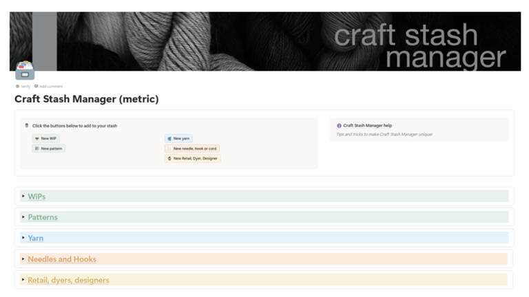A Notion database template which tracks yarn, needles and hooks, patterns and WiPs - all in one searchable place