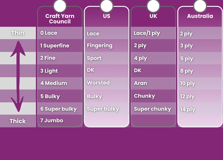 The chart provides a general guide to the different names used for the same yarn weight, based on its thickness. However, yarns don't always fit neatly into these categories, and there’s often disagreement about how names align across regions. That said, the chart offers a helpful reference for understanding where a yarn weight falls on the scale. To ensure your yarn will work for a particular project, it’s always a good idea to knit a gauge swatch.